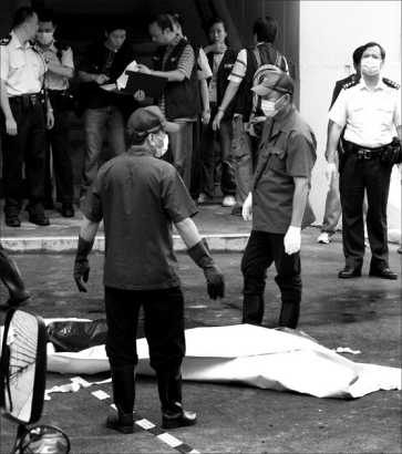 冯建民在港跳楼当场死亡,工作人员准备将尸体抬走