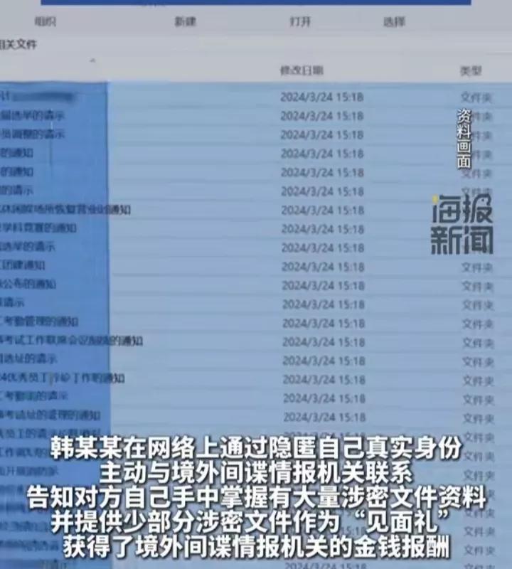 而且韩某为了验证自己并不是在吹牛,他还将窃取的资料分出了一小部分,就像是“投名状”一样,验证自己并没有说谎,间谍机构经过核实了真实性之后,直接就把钱给韩某打了过去。