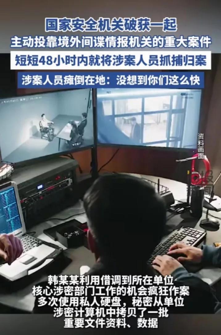 这里也不得不惊叹于国家安全局的破案速度,仅仅不到48小时,就将韩某抓捕归案,避免了韩某进一步出卖机密资料,等待着韩某的将会是法律严厉的制裁。