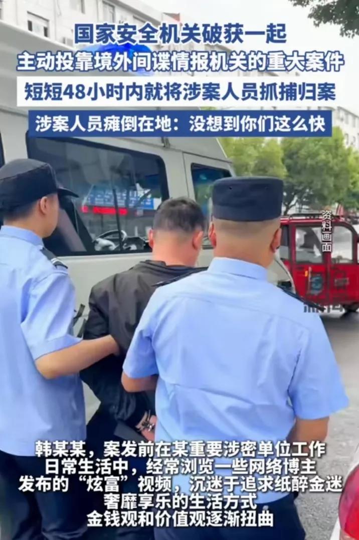 这个出卖机密的当事人被称为韩某,它平时的爱好就是浏览一些短视频网站,并且喜欢看那种别人炫富的视频和直播,幻想自己也过上那种纸醉金迷的生活。