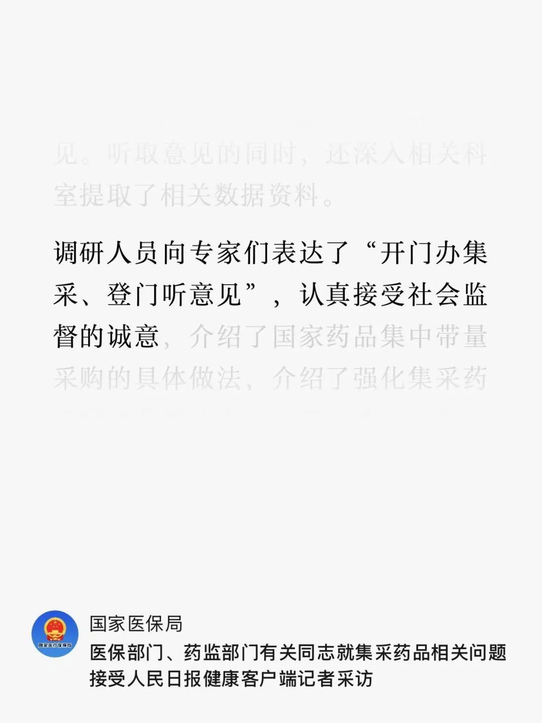 调研人员向专家们表达了“开门办集采、登门听意见”,认真接受社会监督的诚意。