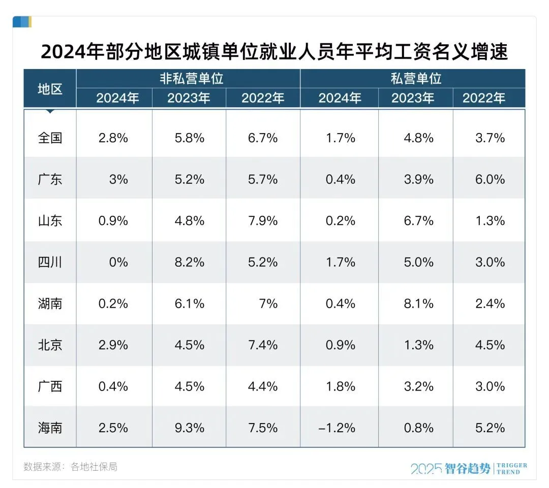 特别是2024年,国内多个省份非私营、私营单位平均工资涨幅相较此前两年出现了较大程度下滑,有部分省份甚至出现了负增长。但相比而言,私营企业工资增速的承压普遍比非私营单位严重。
