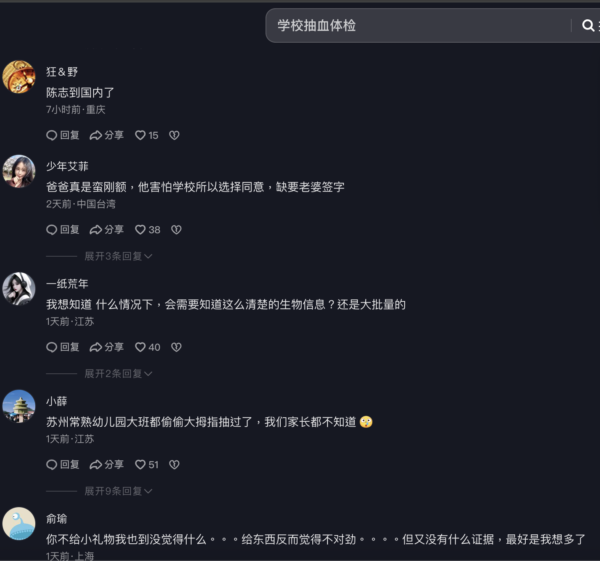 还有网友怒说:“说到底就是基因研究,针对青少年的攻击”、“有的地方直接全体男性!想想,他们想干嘛”、“直接顶问它们,外面那么多因采血引发的青少年消失是不是跟它们有关”、“看来它们需求变大了”、“太可怕了,魔都都敢这样啦?”