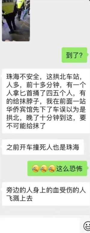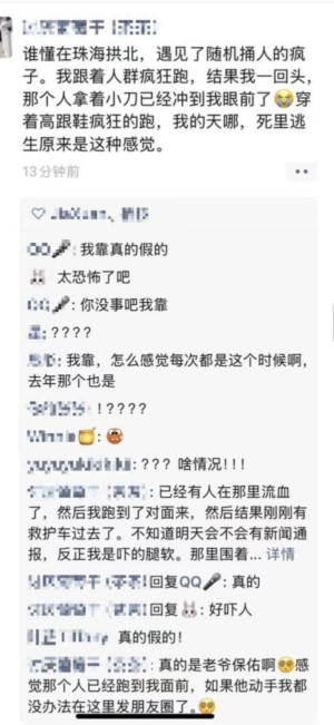 据目击者发帖表示,她在拱北遇见男子随机捅人,吓得她穿着高跟鞋跟人群疯狂逃命,第一次体验“死里逃生”的感觉。