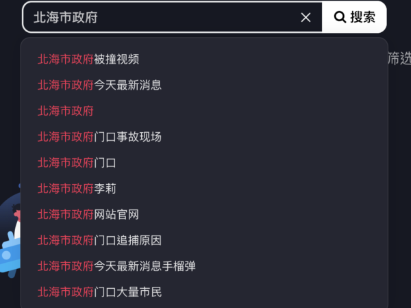 记者在微博上搜不到任何消息。但直至11月25日,在抖音平台,仍可看到众多网友的搜索记录,包括“北海市政府被撞视频”、“北海市政府今天最新消息”、“北海市政府”、“北海市政府门口事故现场”、“北海市政府门口”、“北海市政府李莉”、“北海市政府网站官网”、“北海市政府门口追捕原因”、“北海市政府今天最新消息手榴弹”、“北海市政府门口大量市民”等。
