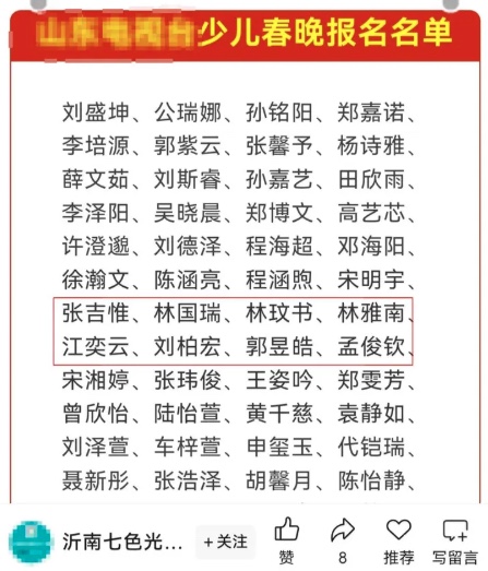 网友扒出,2023年,“最忙五人组”的名字出现在山东电视台少儿培训机构公示的少儿“春晚”报名名单中。