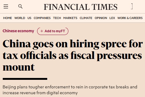 英国《金融时报》周一(1月26日)最新报道,随着北京方面加快税制改革,并试图在预算赤字扩大的情况下加强执法,中国计划在今年招聘超过十年来最多的税务官员。