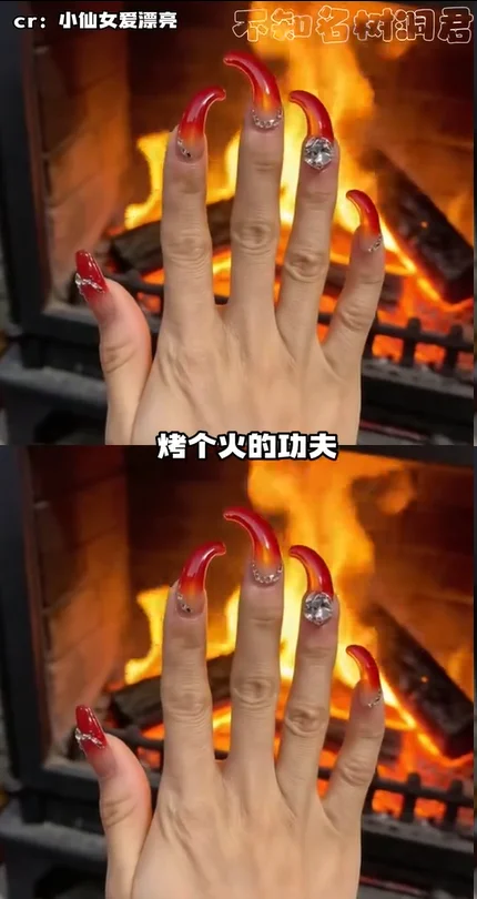有女生做了漂亮的新年美甲回家过年,被父母招呼去烤火。靠近火源没多久,这一手的指甲瞬间变成内扣的鸡爪形状。