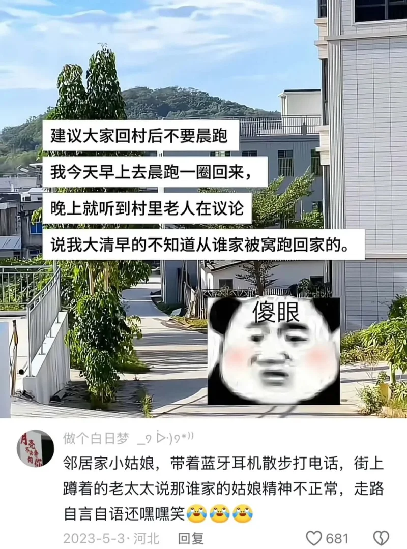 还有大学生早起带着蓝牙耳机跑步,转头便被村里人说不知道从谁家被窝跑回家,也有人说对着空气自言自语呵呵笑的,疑似是在发疯。