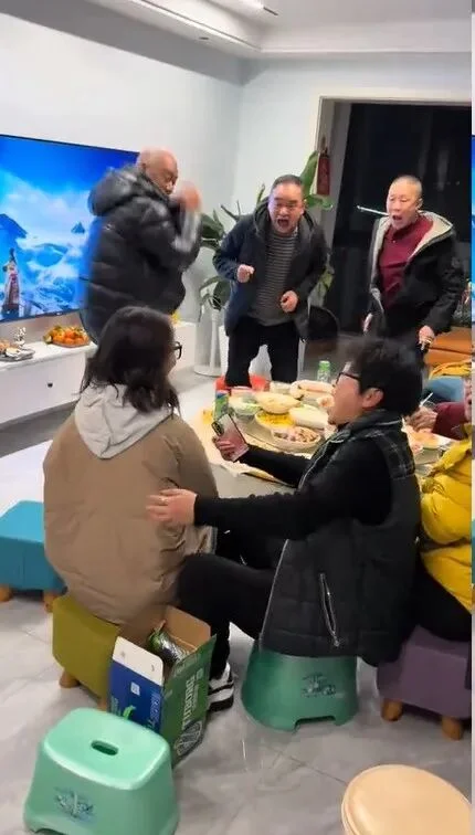 亲戚已经到达客厅,开始拜年走亲戚,大家坐在一起谈笑风生,此时刚起床的大学生衣冠不整地出去洗漱,免不了亲戚家人调侃揉捏一番。