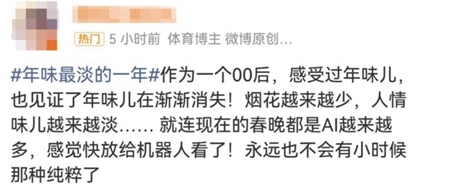 还有人说,今年是“年味最淡的一年春节,AI味最浓的一年春节”“机器人全面入侵春晚”“不仅是没年味,连人味也没了,至少不会因为知道会被骂就全网捂嘴下架『不发言论』”。