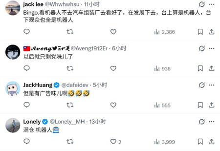 在海外X中文平台上,有中国网友说,今年春晚是“历史上最恶心的一场春晚,赤裸裸的商业广告搭台”“明年干脆就办成机器人春晚得了,反正没什么真人会去看”。