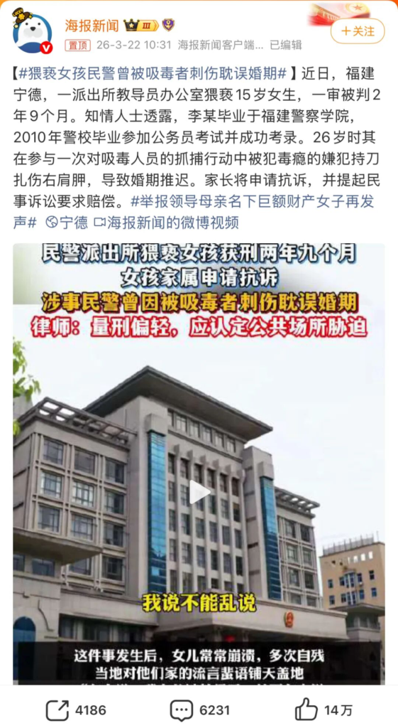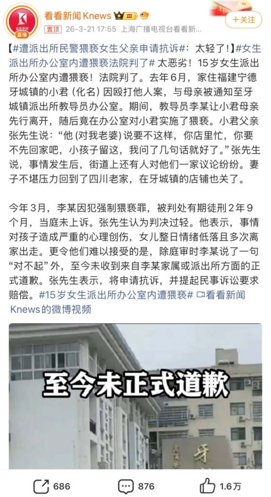 第三,法院说的从重处罚,但却只判了2年9个月,你能想象一个未成年少女,被派出所的人强制猥亵,这让未成年人的三观彻底崩塌,警察不是保护人民的吗?怎么这个这么坏?