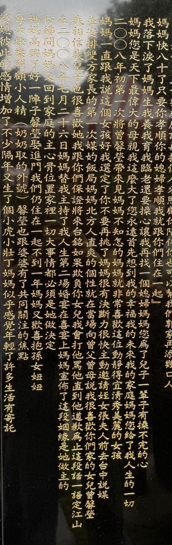 在“真永园”最右边有一块很显眼的大理石墙,这是郭台铭特别为母亲所打造的,既壮观又大气,上面刻下的是郭台铭为母亲所撰写的六千字长文。长文的第一句就是“先慈郭母初永真太夫人百岁志铭”,而内文全篇以第一人称撰写,就是以郭台铭的人称书写。而整篇内容记录了初永真百岁一生12段里程碑,从出生到成长、求学、结婚,还包括从大陆移居到台湾,在当地生儿育女,甚至连送别先夫、长媳、小儿子以及晚年生活都有。