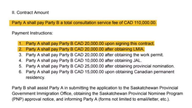 包在签订合约时支付了第一笔2万加元,并在成功通过劳动力市场影响评估(LMIA)后支付了第二笔2万加元——LMIA是加拿大雇主有时需要用来雇用外国工人的文件。