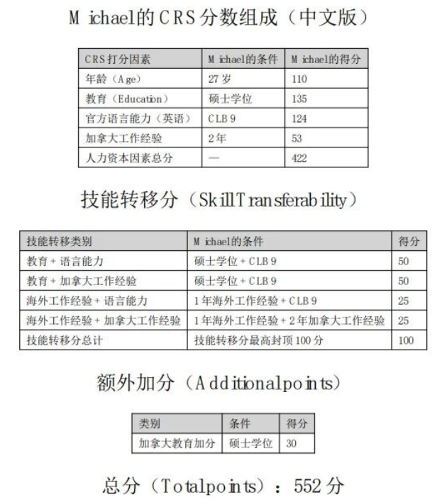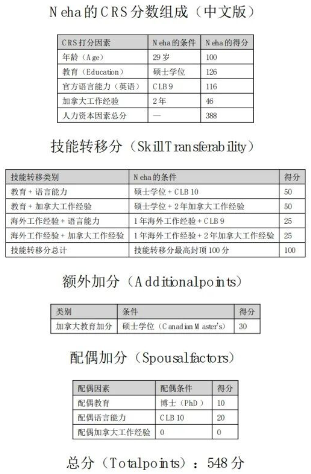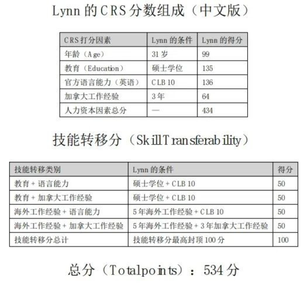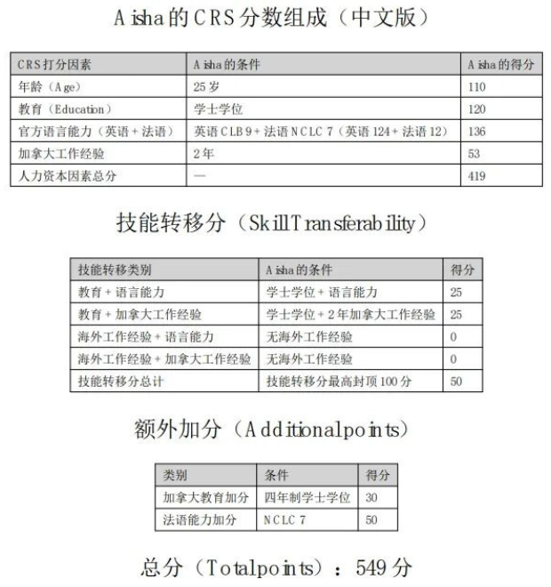 根据她的人力资本因素与工作经验,她的CRS 分数如下:
