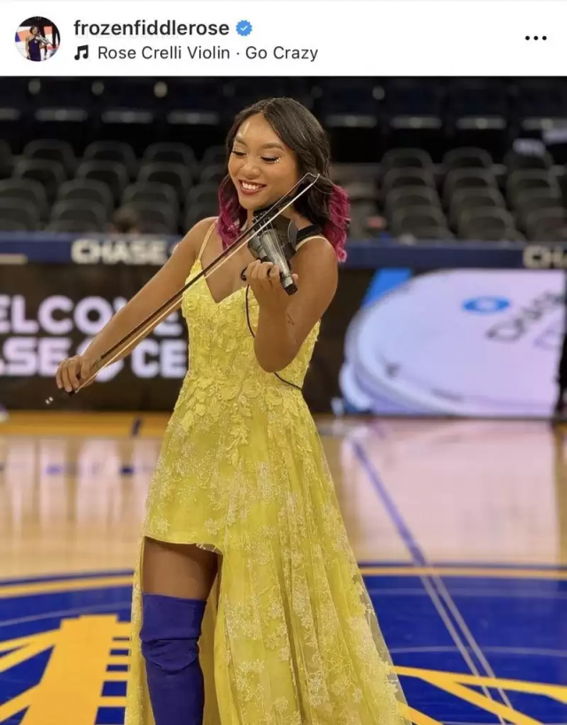 她在社交媒体Threads上分享了一张演出结束后不久身着舞台服装、手持小提琴站在球场上的照片。