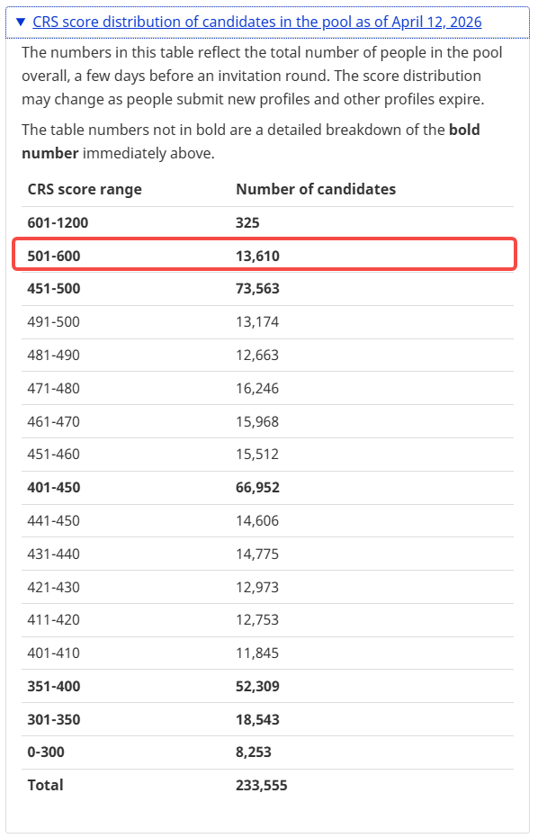 截止4月12日,EE候选池内还有13.610名501-600分的候选人。这也意味着,高分段竞争依然非常激烈。