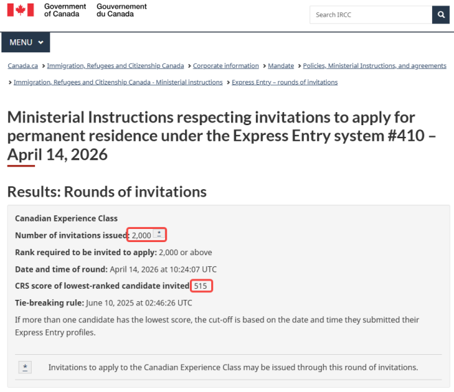 今天(4月14日),加拿大移民部(IRCC)再次通过快速通道(Express Entry,简称EE)系统发出最新一轮移民申请邀请(ITA)。