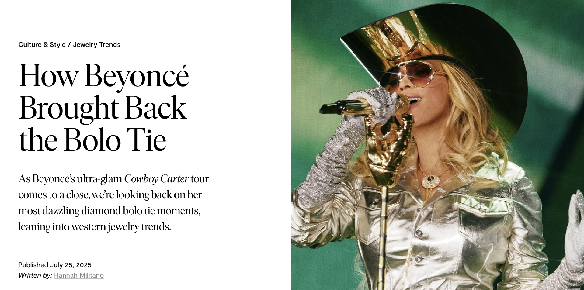 同样,Beyoncé 在最近 Cowboy Carter 巡演中也多次佩戴以钻石为主要元素的波洛领带。作为世界顶级巨星之一,她的影响力带动了一系列高奢珠宝定制商对钻石与波洛领结的狂热。
