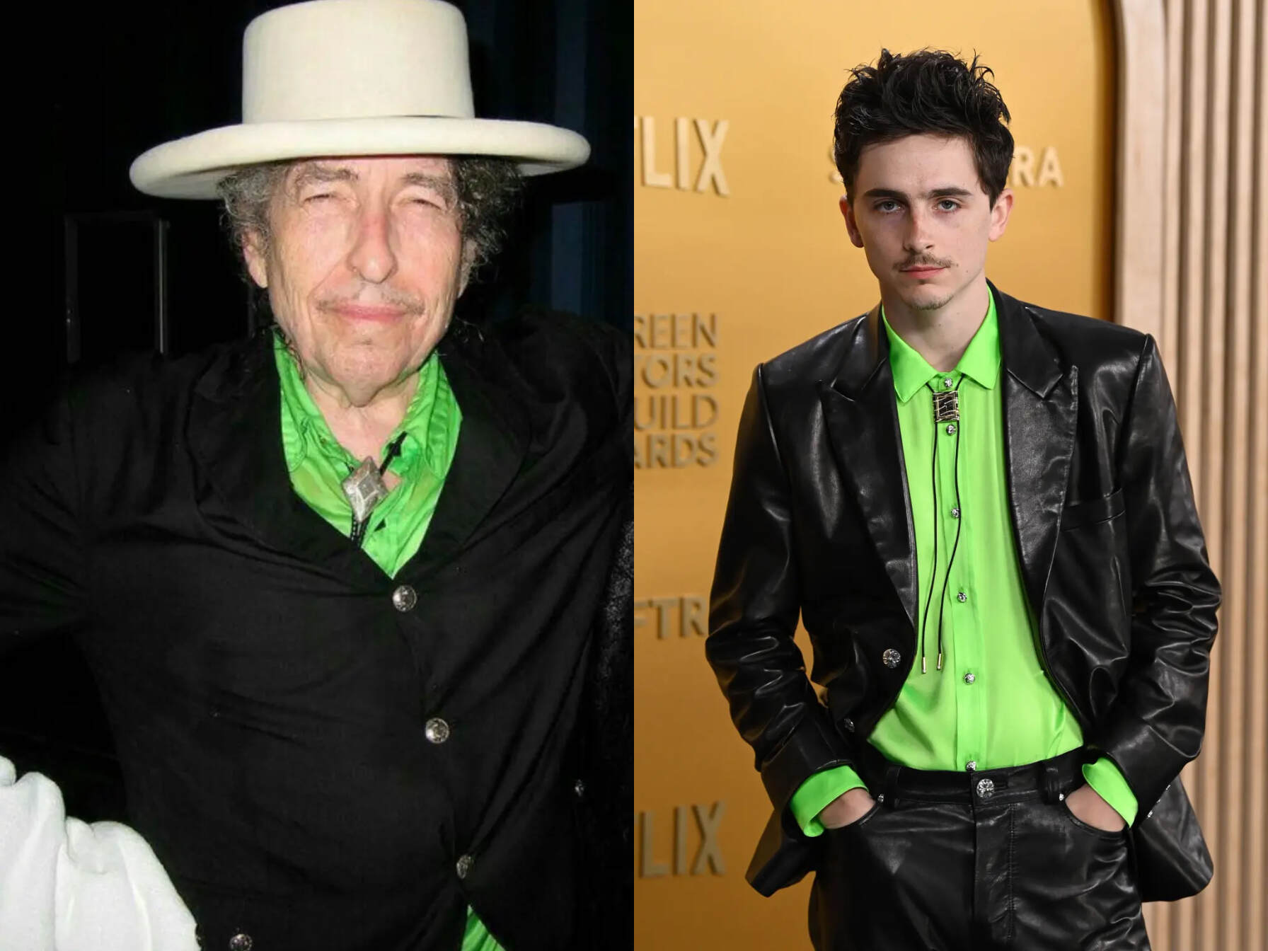 在今年2月左右,Timothée Chalamet 在美国演员工会奖红毯向Bob Dylan在 2011 年所穿的一套造型致敬。