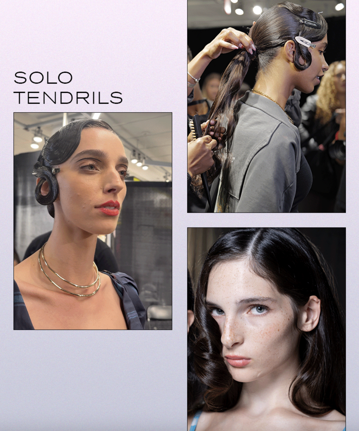 或者,在脸旁垂下的一根光滑卷发。首席造型师 Evanie Frausto认为,两根的话会让人误以为是Y2K风格,但他想表达的是一种“90年代超模遇上清新女孩”的感觉。