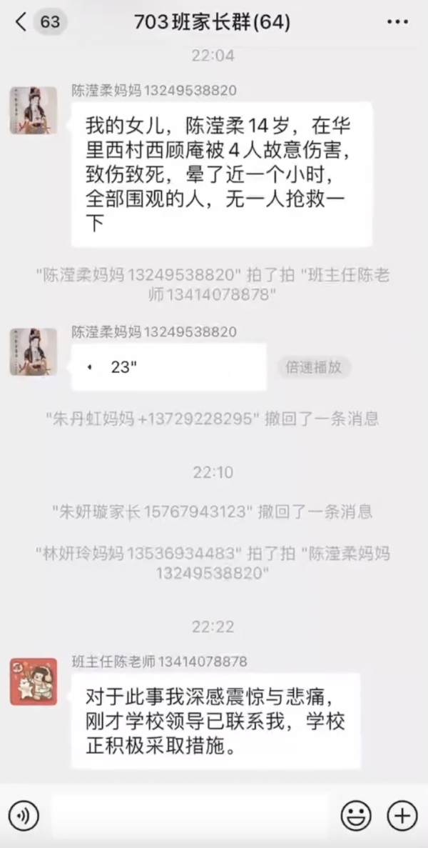 之后也传出,女孩母亲在班级群求助的视频,女孩母亲留言称,自己女儿名叫陈滢柔,今年14岁,在华里西村的西顾庵被4人殴打致死,近一个小时无人施救,哭诉不知怎么办。