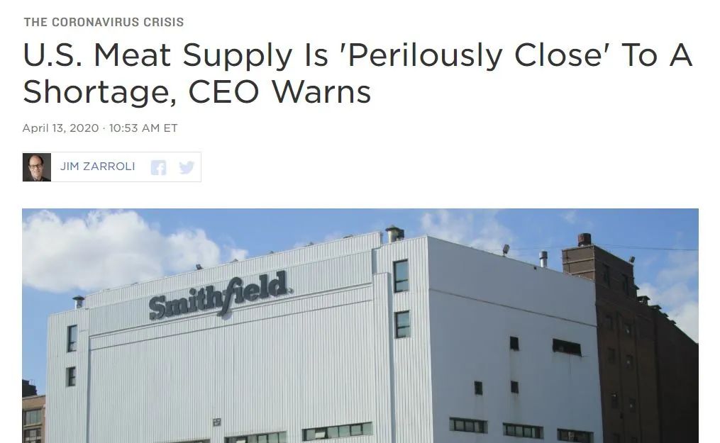 4月12日,全球最大猪肉加工厂史密斯菲尔德(Smithfield)宣布无限期关闭。该公司警告说,新冠疫情正在使全美的肉类供应“接近危险”边缘。很快,美国将面临“肉荒”。