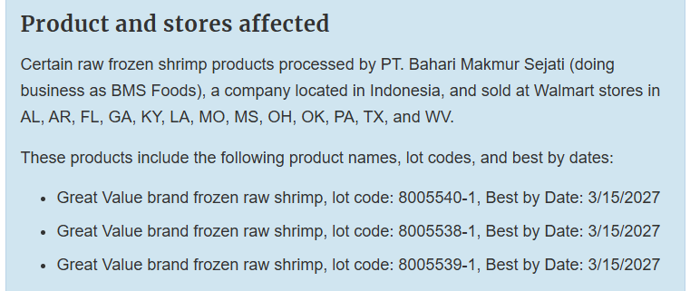 目前,受影响的冷冻虾主要流向了美国 13 个州,包括阿拉巴马、阿肯色、佛罗里达、乔治亚、肯塔基、路易斯安那、密苏里、密西西比、俄亥俄、俄克拉荷马、宾夕法尼亚、德克萨斯以及西弗吉尼亚。