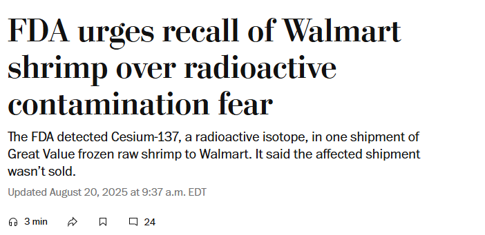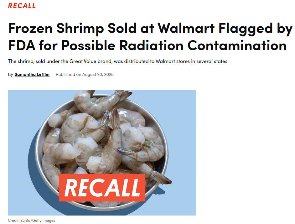 美国食品与药物管理局(FDA)通报,部分沃尔玛销售的 Great Value 品牌冷冻虾,在海关和实验室检测中发现了放射性铯-137(Cesium-137)残留,引发广泛关注。
