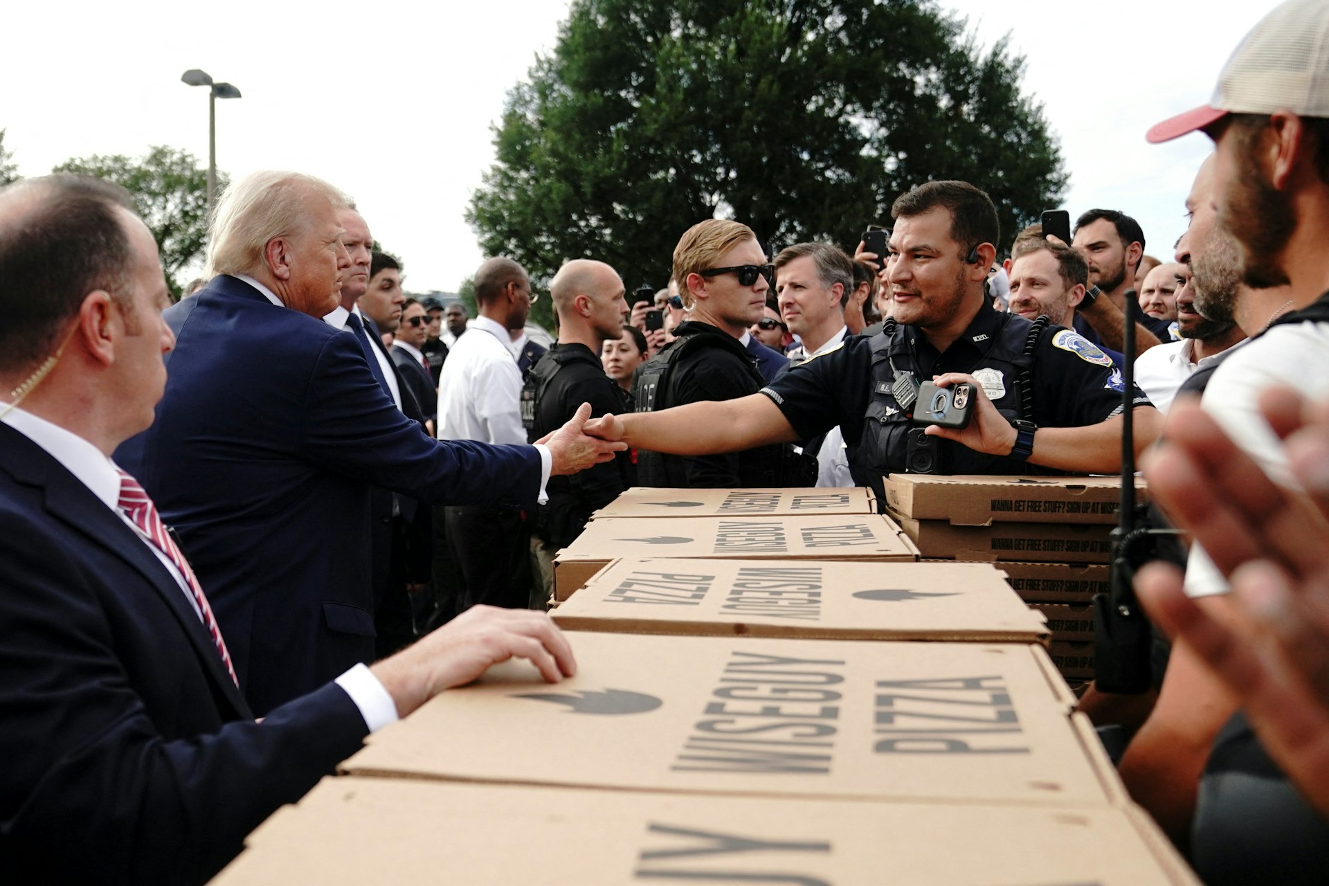 川普其后还为现场的执法人员和国民警卫队士兵送上了当地连锁店Wiseguy的披萨和白宫食堂的汉堡包。
