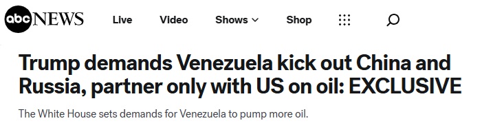 据ABC援引三位不具名知情人士报道,美国还要求委内瑞拉削弱与中国、俄罗斯、伊朗和古巴的关系。ABC称,委内瑞拉被告知必须将这四个国家“赶出去”,并切断经济联系。