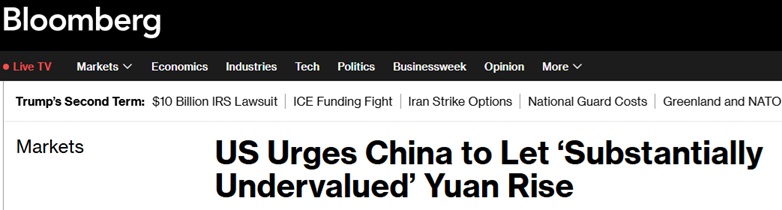 彭博社1月29日报道,美国财政部将人民币形容为“严重低估”,并呼吁中国允许人民币汇率以及时和有序的方式升值。