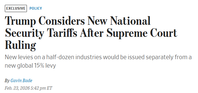 在最高法院上周裁定川普多项第二任期关税措施无效后,白宫正酝酿以“国家安全”为由开辟新的加税通道。据华尔街日报周一(2月23日)披露,川普政府考虑依据《1962年贸易扩展法》第232条,对包括大型电池、铸铁及管件、塑料管材、工业化学品、电网与电信设备等在内的多个行业启动或推进关税调查,以维持对外贸易施压并重塑关税收入结构。