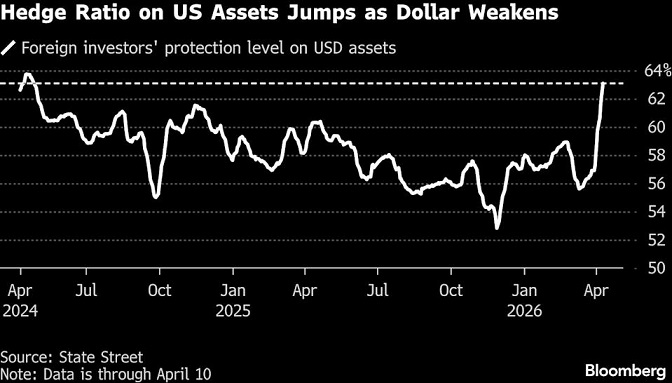 根据道富银行(State Street Corp.)的数据,投资者已将美元对冲比例提高至两年来的最高水平。与此同时,在期权市场,对美元的信心有所减弱,相关仓位的看涨程度降至数周以来最低。