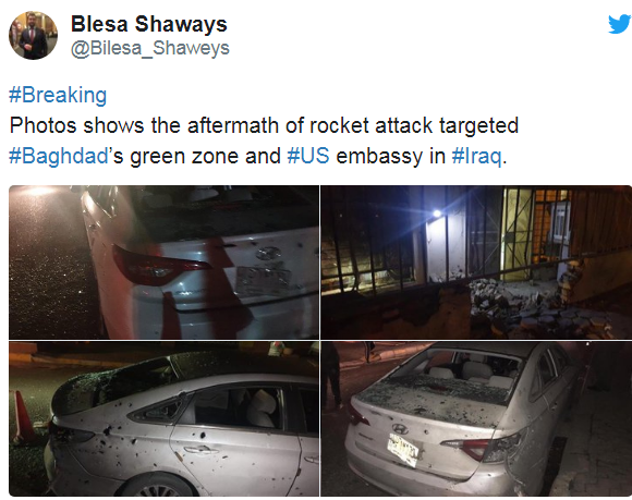 伊朗英语电视台(Press TV)报道,有目击者早前声称,在伊拉克首都听到了爆炸声。英国广播公司(BBC)记者Nafiseh Kohnavard在推特上写道,“美国驻伊拉克首都巴格达大使馆遭到导弹袭击。”在听到爆炸声后不久,美国直升机在巴格达上空盘旋。