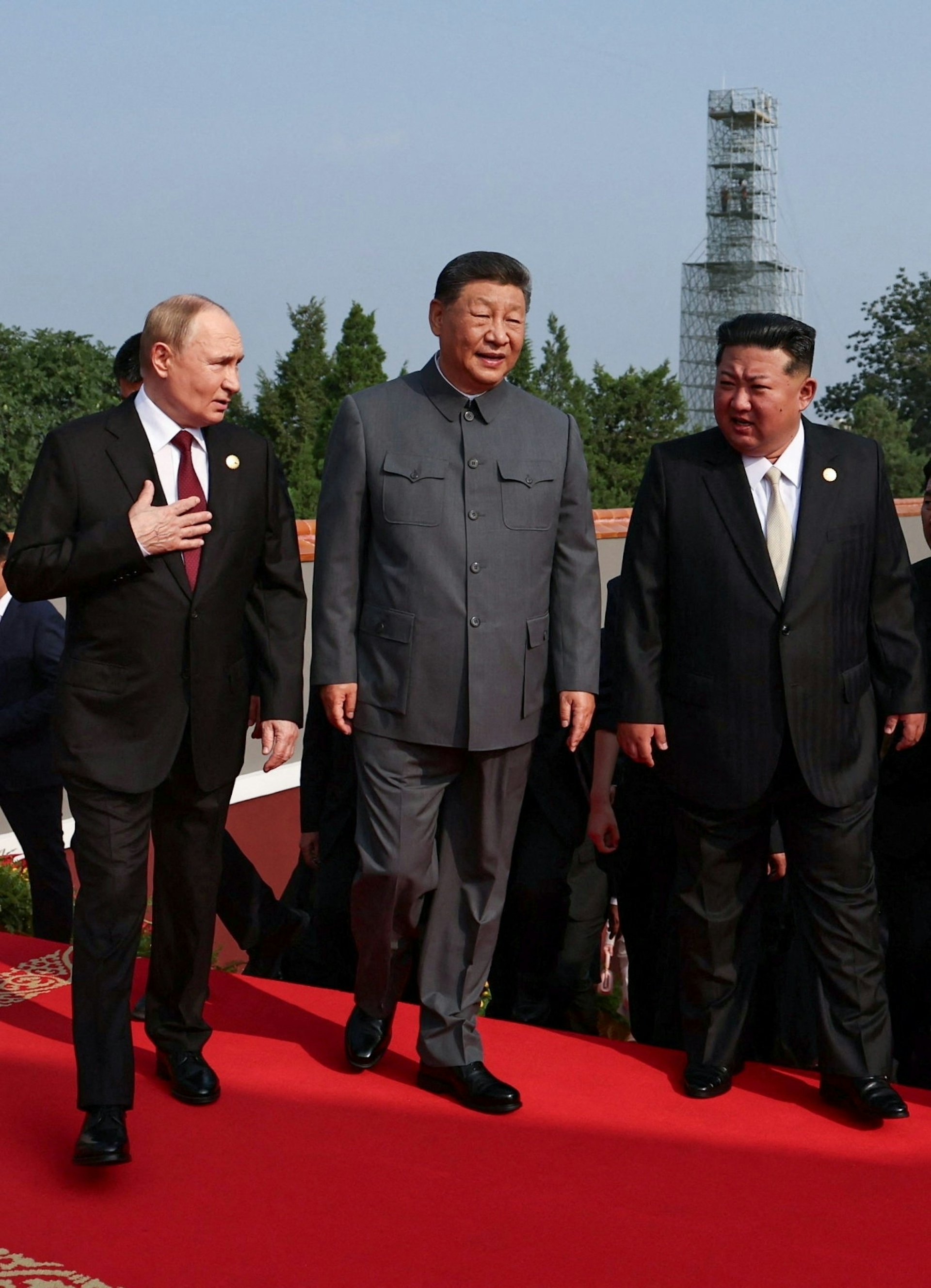 2025年9月3日在阅兵开始前习近平陪同外宾登上天安门城楼,在登楼过程中习近平停下来向金正恩和普京讲解相关历史。(香港01直播视频截图)