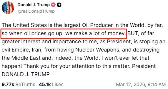 川普3月12日在其社交媒体账号表示,当油价上涨,我们就会挣很多钱。
